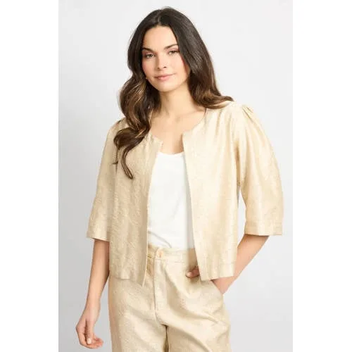 Ga voor een stijlvolle partylook met de ecru dames jas Josephine van CS the Label. Dit korte jasje heeft een glanzende finish met subtiele glitters, waardoor het meteen een feestelijke uitstraling krijgt. De ronde hals en het openvallende ontwerp maken het een elegant laagje over je jurk, top of jumpsuit. Door de halve mouwen blijft je outfit goed zichtbaar en blijft het geheel licht en luchtig, ideaal voor het voorjaar.Feestelijke details in een kort jasje Korte lengte, perfect om over een jurk of hoge taille broek te dragen Halve mouwen met pofmouwen voor een vrouwelijke, moderne look Glimmende stof met glitters voor een feestelijke uitstraling Effen ecru kleur die gemakkelijk combineert met andere tinten Ronde hals die mooi valt over tops met zowel een hoge als lage halslijn Geen zakken voor een strak en clean silhouet Model is 180cm en draagt maat S, voor een indruk van de pasvormIdeaal voor feestelijke momentenDit jasje is een fijne keuze voor bruiloften, diners of andere feestelijke gelegenheden in de lente. Draag het over een satijnen top en een nette broek, of combineer het met een midi-jurk en hakken voor een elegante outfit die de hele avond goed blijft zitten.CS the Label met oog voor detailCS the Label staat bekend om modieuze items met doordachte details en een toegankelijke pasvorm. De collecties sluiten aan op de trends van nu en bieden tegelijk kleding die je makkelijk combineert met wat al in je kast hangt.Met jas Josephine voeg je een feestelijk en stijlvol laagje toe aan je garderobe.