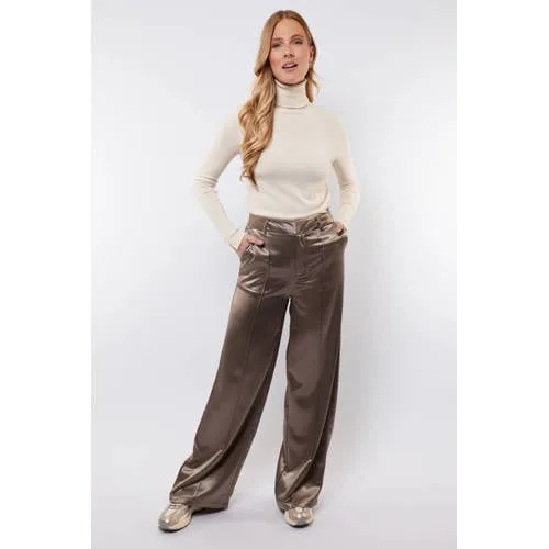 Deze C&S The Label Manarola is gemaakt van 100% polyester. Dit model heeft een wide leg pasvorm en een regular waist. Met glimmend materiaal, rits- en haaksluiting en sierzakken, zakken voor en zakken achter.