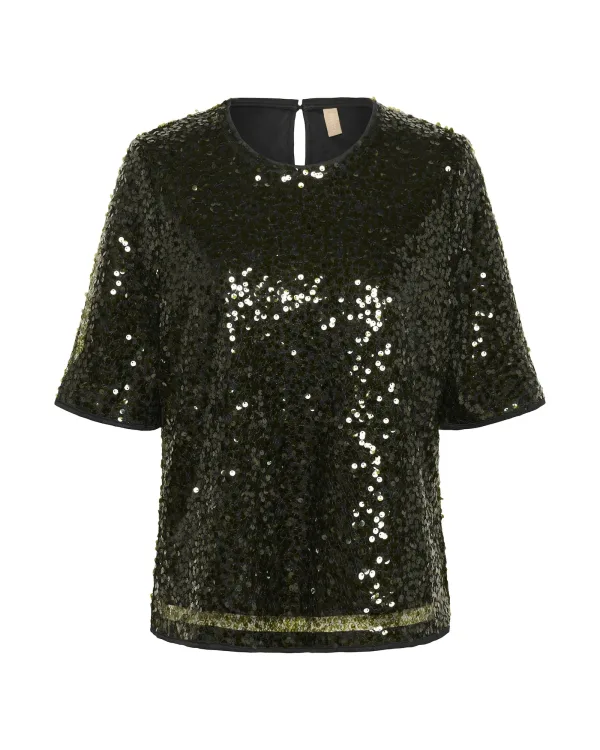 Top met pailletten en een ontspannen pasvorm. Voorzien van ronde hals en korte mouwen. Comfortabel, ideaal voor feestelijke gelegenheden.