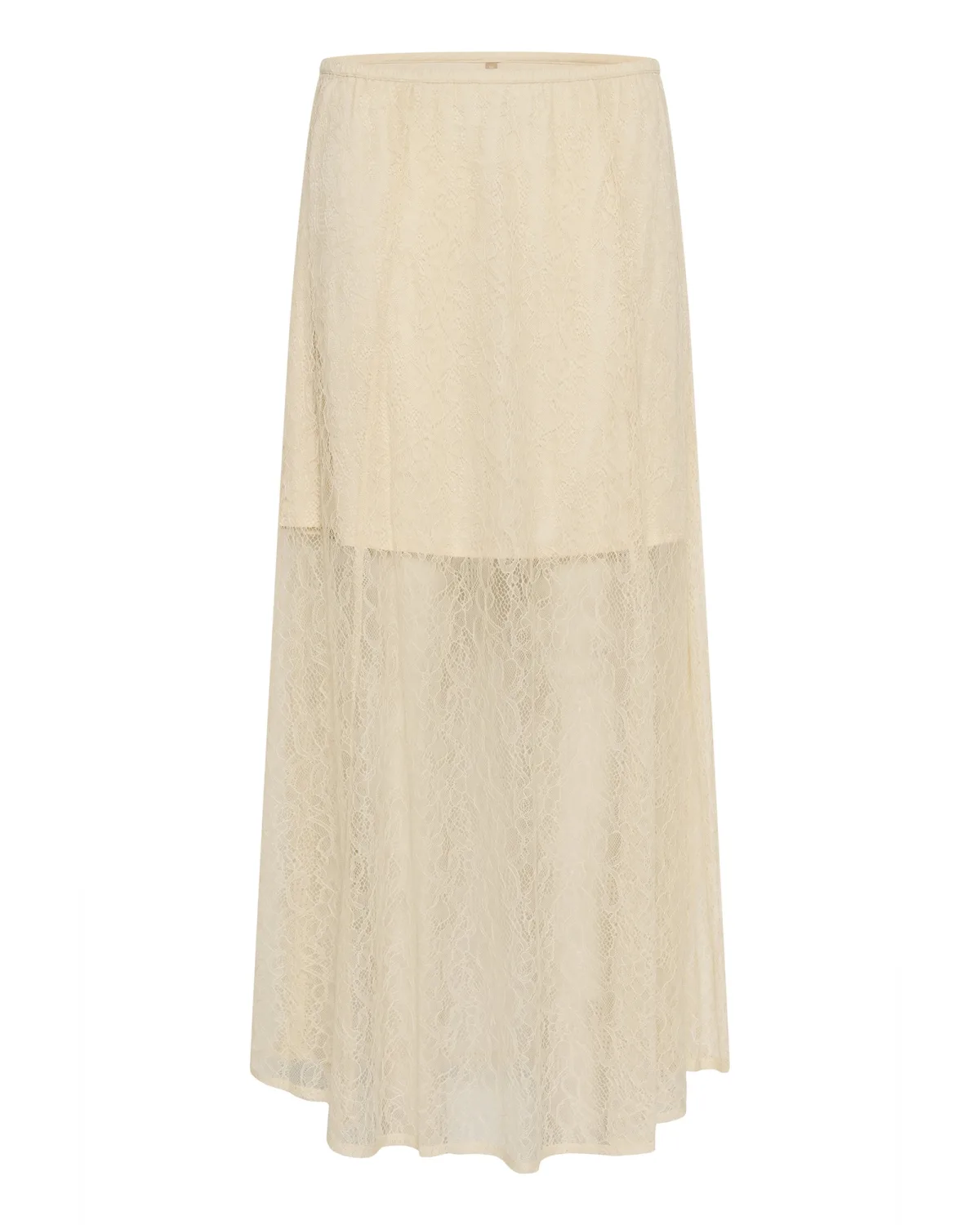Maxirok van kant met comfortabele elastische tailleband en uitlopend model. De semi-transparante laag biedt veelzijdige, stijlvolle draagmogelijkheden.