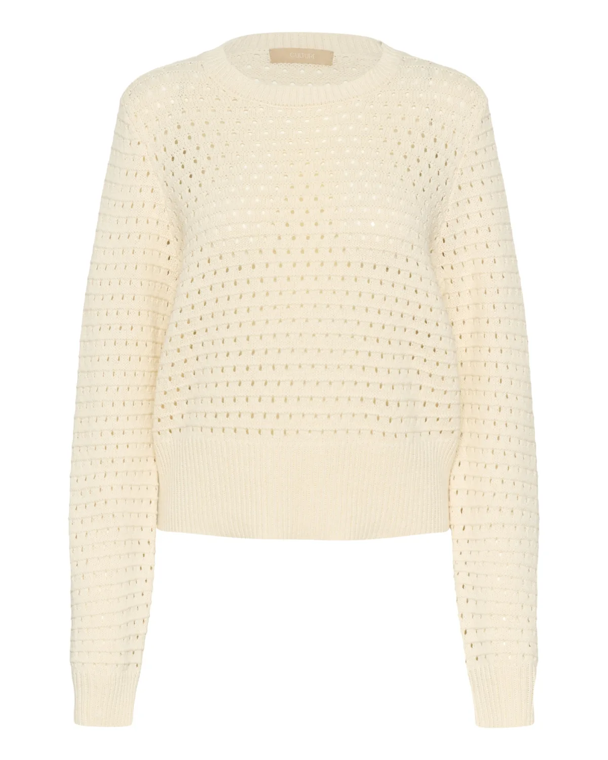Open gebreide trui met rechte, licht relaxte pasvorm. Voorzien van een klassieke ronde hals, lange mouwen en brede geribde boorden voor extra structuur.
