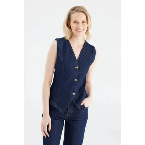 Dit gilet van Cup of Joe Denim is mouwloos en heeft een V-hals. De Pixie stijl heeft een rits- en knoopsluiting en is gemaakt van denim. Contrast stiksels geven het net even iets extra's.