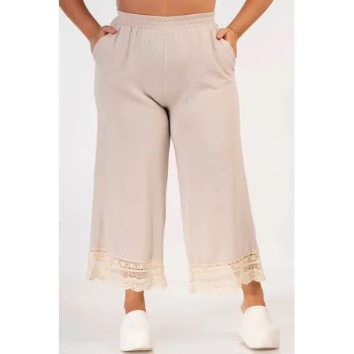 Voeg een luchtige basic toe aan je garderobe met deze beige cropped broek van Curviss. De broek valt losjes om je benen, heeft een hoge taille en reikt tot net boven de enkel. Ideaal voor warme dagen of voor een lichte, zomerse laag in je outfit. De effen kleur maakt combineren makkelijk, terwijl de subtiele kanten details de broek extra karakter geven.Comfortabele pasvorm met stijlvolle details Losse pasvorm voor veel bewegingsvrijheid en een ontspannen look Cropped lengte, geschikt voor zomerse outfits met sandalen of sneakers Hoge taille met elastische tailleband voor een comfortabele, aansluitende fit Zachte, soepele stof die prettig aanvoelt op de huid Zijzakken voor het makkelijk meenemen van kleine essentials Effen beige kleur, goed te combineren met tops in verschillende stijlen Onderdeel van een co-ord set, ook te dragen met een bijpassende top Speciaal ontwikkeld voor het grote maten assortimentIdeaal voor alledaagse zomerse looksDeze broek past goed in je dagelijkse garderobe. Combineer met een luchtige blouse voor een nette look naar kantoor, of draag er een T-shirt en slippers bij voor een ontspannen vrije dag. De cropped lengte laat je enkels zien, wat goed combineert met zowel platte schoenen als een hak.Curviss: mode met oog voor pasvormCurviss richt zich op dames met grote maten en besteedt veel aandacht aan pasvorm en draaggemak. De modellen zijn afgestemd op rondingen, zodat de pasvorm goed aansluit en de kleding comfortabel zit. Met deze broek kies je voor een item dat is ontworpen met aandacht voor pasvorm en dagelijks comfort.Een praktische basisbroek voor zomerse dagen waarop comfort en een rustige, stijlvolle look centraal staan.