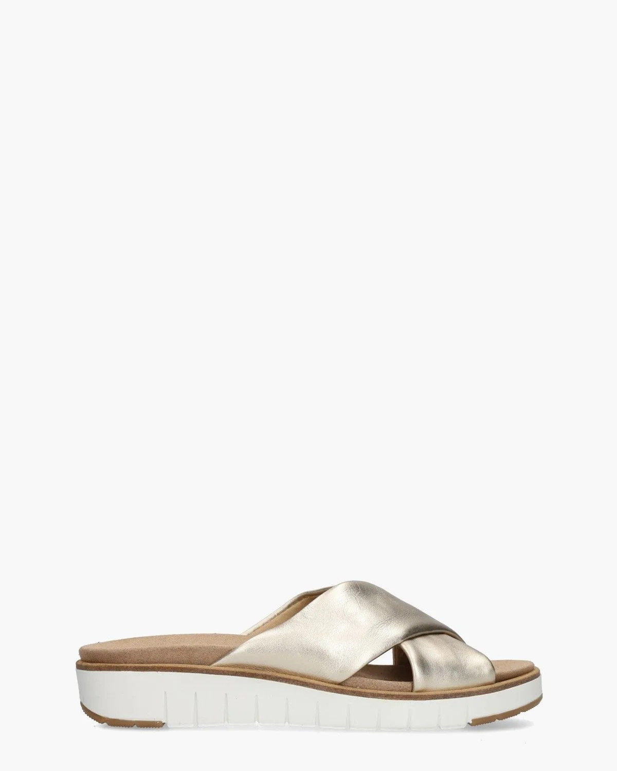 Zomers comfort met een subtiele glans. De Mia damesslipper van Cypres valt op door de zachte goudkleurige leren kruisbanden met een verfijnde structuur. Het uitneembare suèdine voetbed heeft een licht anatomische vorm en ondersteunt de voet op een natuurlijke manier. De wit met bruine rubberen zool van circa 3 cm hoog biedt een fijne