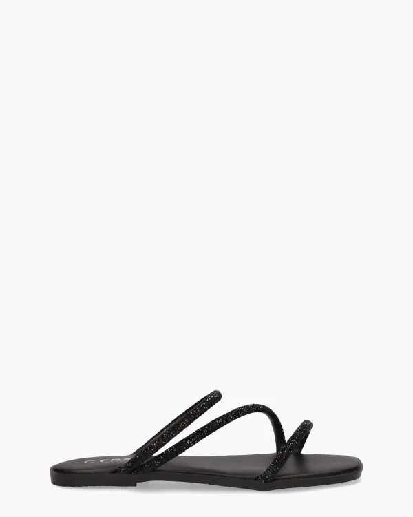 Slippers voor dames Tizia I uit de collectie van Cypres. Dit model heeft een bovenwerk van leer voorzien van zwarte glinsterende steentjes. De dunne bandjes lopen diagonaal over de wreef. De binnenkant en het voetbed zijn ook in leer uitgevoerd. Het lage hakje is circa 1 cm hoog. De zool is van rubber gemaakt. Kleur: zwart.