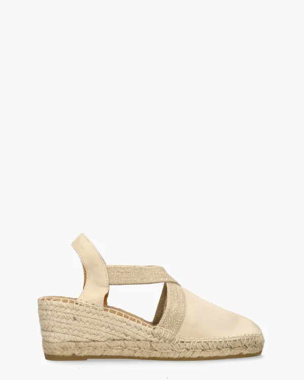 Deze Tona damessandalen in espadrille-stijl van Cypres hebben een off-white suède bovenwerk. De leren voering en het zachte lederen voetbed geven extra comfort. De elastische kruisbanden zijn gemaakt van beige geweven stof en zorgen voor een perfecte pasvorm. Met de gevlochten touwzool van ongeveer 5,5 cm hoogte creëer je moeiteloos een