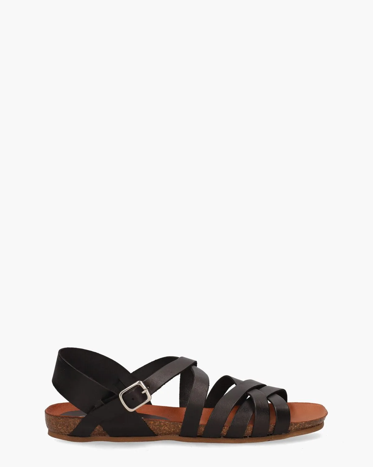 Sandalen voor dames met de naam Twanny, afkomstig van het merk Cypres. Deze sandaaltjes met gekruiste banden zijn vervaardigd met een bovenwerk van zwart glad leer. Het wreefbandje is verstelbaar met een zilveren gespje. De binnenkant is bekleed met stof, terwijl het licht voorgevormde, comfortabele voetbed van kurk met leer is bekleed. De