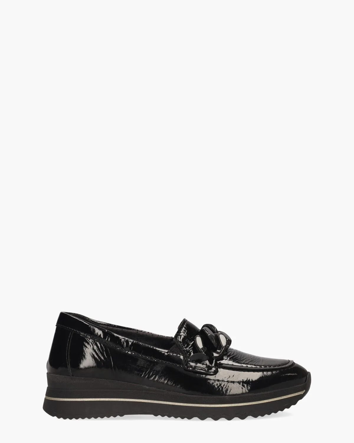 De damesloafers Victoria van Cypres bieden een stijlvolle mix van sportiviteit en comfort. Gemaakt van zwart gestructureerd lakleer, hebben deze instappers een opvallende en luxe uitstraling. De binnenzijde is in imitatieleer en stof uitgevoerd en voorzien van een extra zacht uitneembaar voetbed voor optimaal comfort. Dezwarte chain op