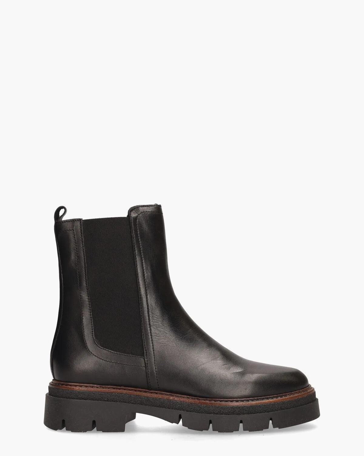 Chelseaboots voor dames Viola uit de collectie van Miss Behave. Dit model is gemaakt van zwart leer. Aan de zijkant zijn de boots met elastisch materiaal afgewerkt. De laarsjes hebben een ronde leest en de schacht is ongeveer 15,5 cm hoog. Aan de binnenkant zijn de booties ook in leer met een vast voetbed uitgevoerd. De rubberen zool heeft