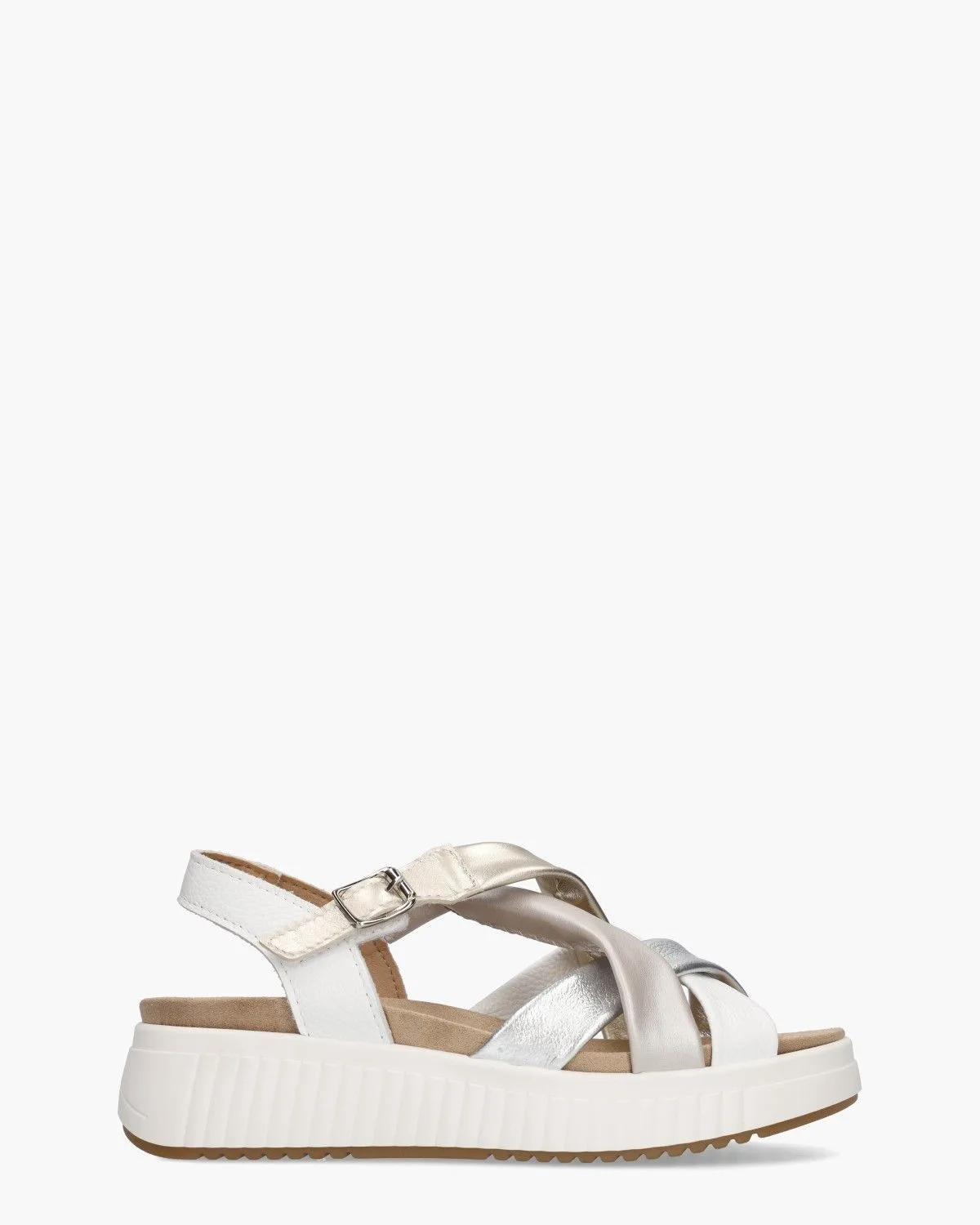 Deze Zonia damesslippers van Cypres hebben een bovenwerk van zacht leer in een elegante mix van wit, lichtgrijs, metallic zilver en goud. Dankzij het verstelbare gespbandje met een zilveren gespje sluit de sandaal mooi aan rond de voet. De binnenzijde is voorzien van een soft kunststof voetbed dat bovendien uitneembaar is. De witte