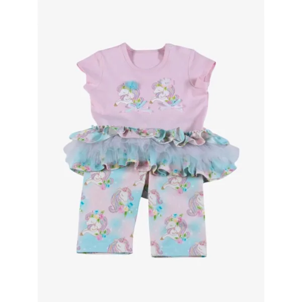 De Daga Bikershort Set uit de Girls Faves collectie bestaat uit een bikershort met all over unicorn print en een top met verschillende lagen met tulle.
