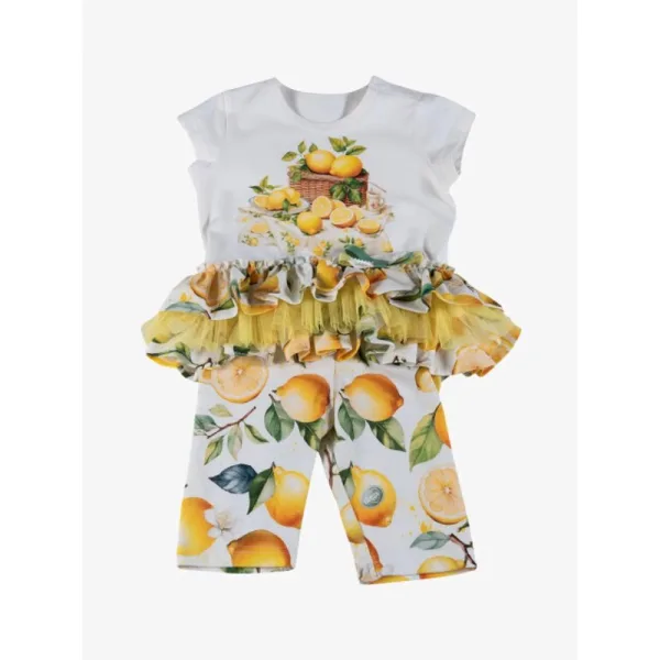 De Daga Bikershort Set uit de Sunny Lemons collectie bestaat uit een bikershort met all over citroenen print en een top met verschillende lagen met tulle.