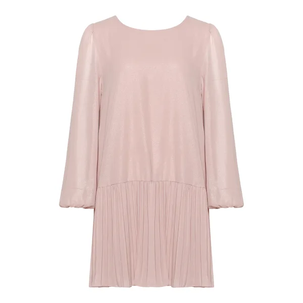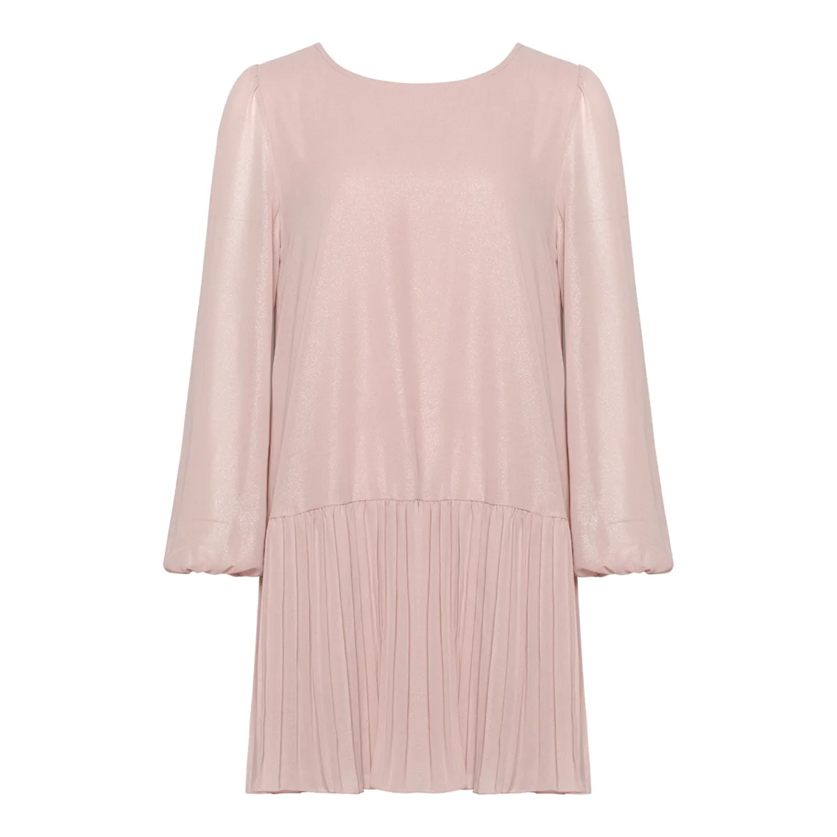Een chique en vrouwelijke mini-jurk met een zacht, zwierig silhouet. Hij heeft transparante lange mouwen, een ronde hals en een geplooide rok die voor een mooie beweging zorgt. De subtiele glans in de stof geeft hem een elegante touch, waardoor hij perfect is voor zowel feestelijke gelegenheden als avondevenementen. Combineer hem met hakken en een clutch voor een verfijnde look.