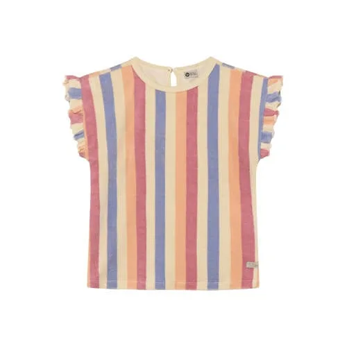 Breng wat kleur in elke dag met dit Daily7 T-shirt met korte mouwen voor meisjes. Het roze T-shirt heeft een speelse multicolor streepprint en fijne ruches langs de schouders, waardoor het meteen een frisse en levendige uitstraling krijgt. De rechte mouwen en de ronde hals zorgen voor een comfortabele pasvorm, terwijl de zachte stof soepel meebeweegt tijdens spelen, rennen en ontdekken.Praktische details voor elke dag Roze/multicolor streepprint die makkelijk combineert met jeans, rokjes en shortjes Ruches op de schouders voor een speels en verfijnd detail Gemaakt van 80 procent katoen, met een zachte touch die prettig aanvoelt op de huid Knoopsluiting in de nek zodat het T-shirt makkelijk aan en uit gaat Korte mouwen en rechte mouwinzet, ideaal voor schooldagen en speelafspraken Geschikt voor peuters, kleuters en schoolkinderen Wasbaar op 30 graden en lauw strijkbaar, zo blijft de print mooi en fris Niet drogen in de droogtrommel, wat helpt om de vorm en kleur langer te behouden Onderdeel van een co-ord set, leuk te dragen met bijpassende items uit dezelfde lijnVoor speelse dagen vol bewegingDit T-shirt is gemaakt om in te bewegen. Of het nu gaat om een schooldag, een feestje of een middag in de speeltuin, de soepele stof en lichte pasvorm geven volop ruimte om actief te zijn. De knoopsluiting maakt omkleden eenvoudig, ook voor kleinere kinderen.Daily7, kleding voor elke dag van de weekDaily7 ontwerpt kinderkleding die past bij het drukke en vrolijke leven van kinderen. De collectie combineert comfortabele stoffen met eigentijdse details en prints. Zo ontstaat kleding waarin kinderen zich vrij voelen om te spelen, terwijl ouders kunnen rekenen op betrouwbare kwaliteit en doordachte afwerking.Een kleurrijk T-shirt dat goed past bij speelse dagen.
