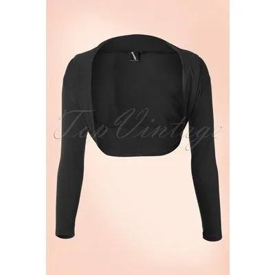 De Lady Folded Bolero in Black van Banned is een klassiek kort vestje in een elegante zwarte kleur. Uitgevoerd in een soepel stretchy stofje en afgerond aan de voorzijde zodat hij mooi langs je buste valt. Deze bolero heeft een fijne aansluitende pasvorm die mooi in vorm blijft en is de perfecte finishing touch voor iedere retro look!