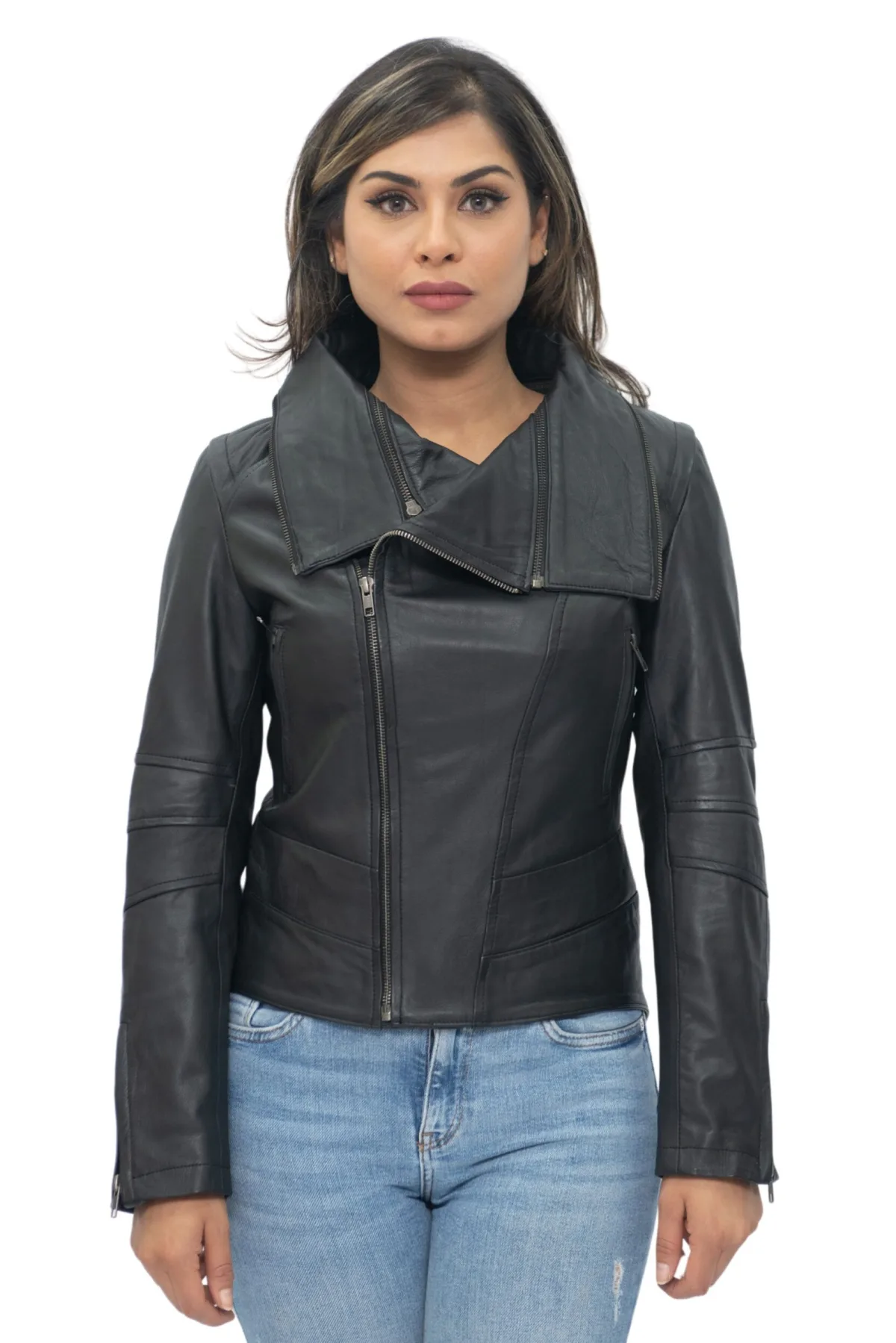 Dames afneembare kraag leren bikerjackRosario
