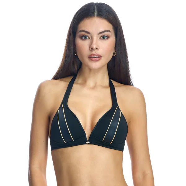Dames bh met draadloze halter W241705 Deze bh heeft een halterstijl ontwerp, met bandjes die rond de nek geknoopt kunnen worden in plaats van traditionele bandjes. Het halterontwerp met bandjes om de nek biedt optimale ondersteuning en pasvorm. Hij heeft een randloze cup voor een natuurlijker, zachter en comfortabeler effect bij de buste. Het heeft een haaksluiting op de rug voor gemakkelijk aan- en uitkleden. Cutting-edge stof die ultra-chloorbestendig is, met UV-bescherming, pilling-resistentie, IC-ademend, spierinsluiting, uitstekende dekking, perfecte pasvorm, extra comfort, bi-elastisch en bestand tegen zonnecrèmes en oliën. Samenstelling: Buitenvoering: 75% Polyamide, 25% Elastaan. Binnenvoering: 44% Elastaan, 32% Lycra, 24% Polyester. Cup: 100% Polyester. Onderhoud: Handwas. Geen bleekmiddel gebruiken. Niet in de droger. Niet strijken. Niet chemisch reinigen. Niet uitknijpen.