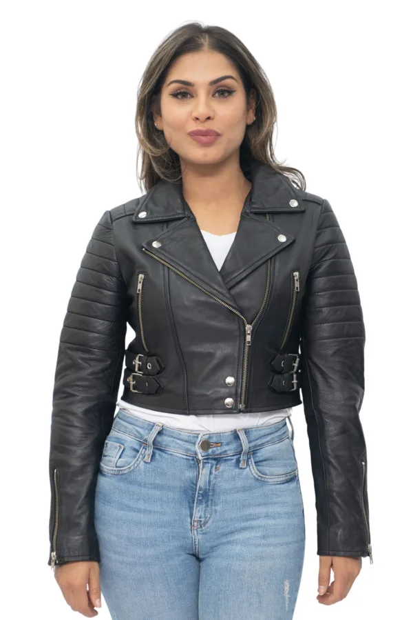 Dames bijgesneden Brando leren bikerjack-Damascus Prijzen