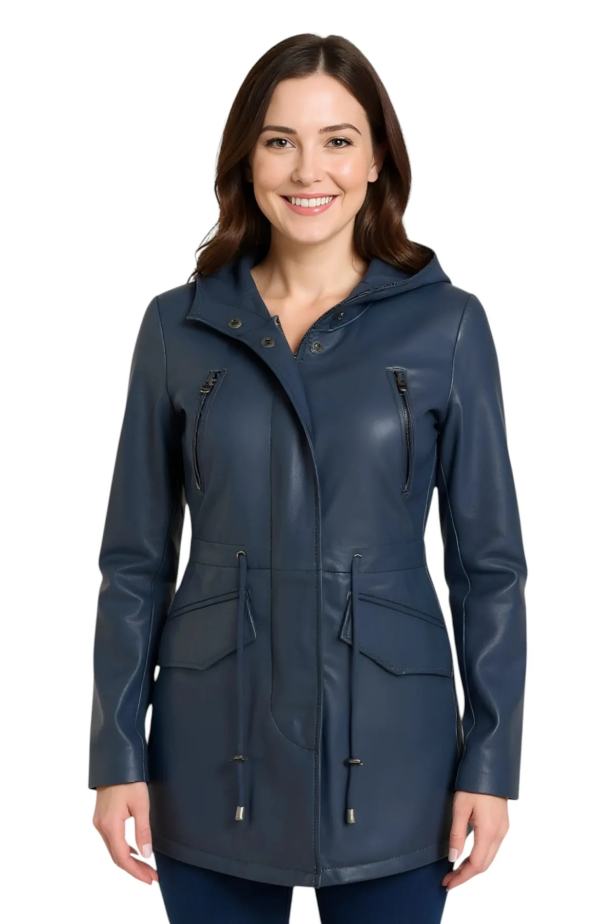 Dames blauwe leren parka met capuchon – Cairns