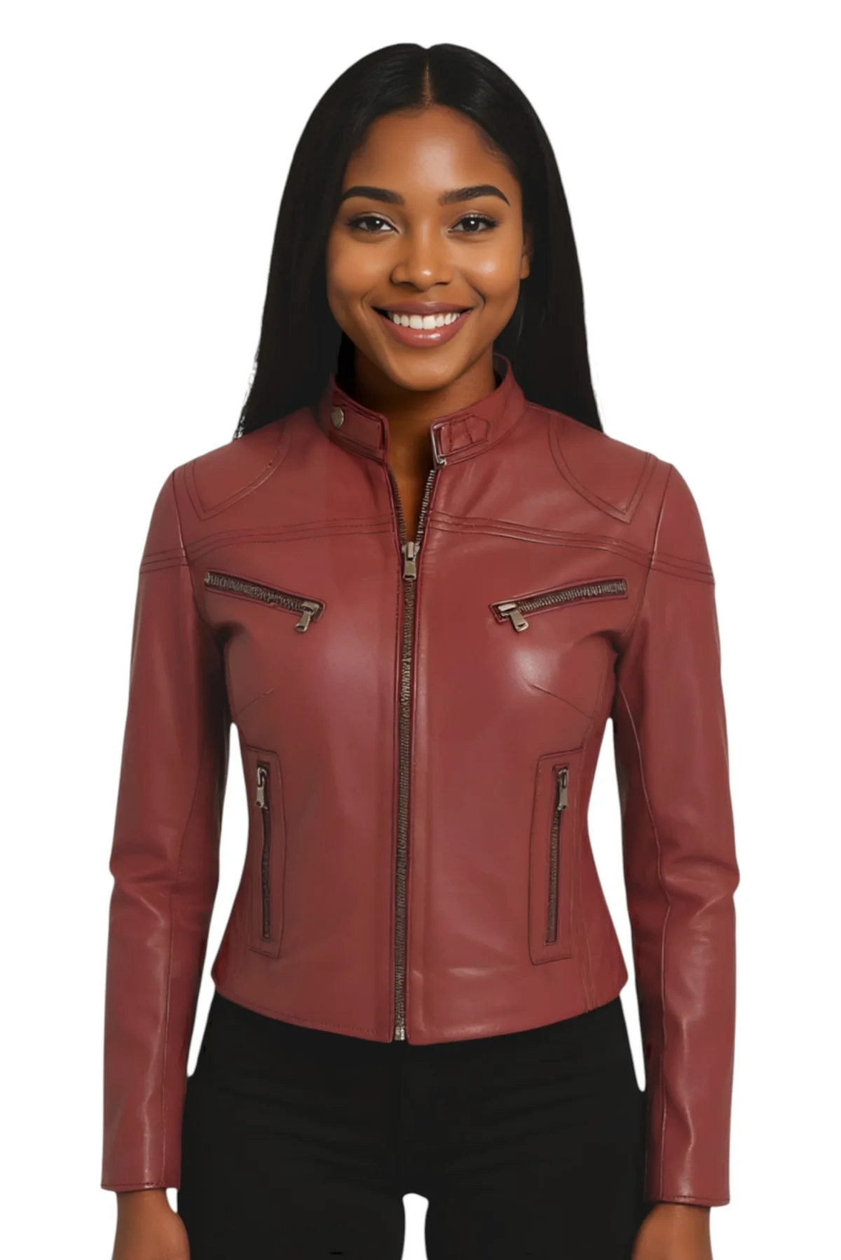 Dames bordeauxrood casual slim-fit leren bikerjack – Tulsa