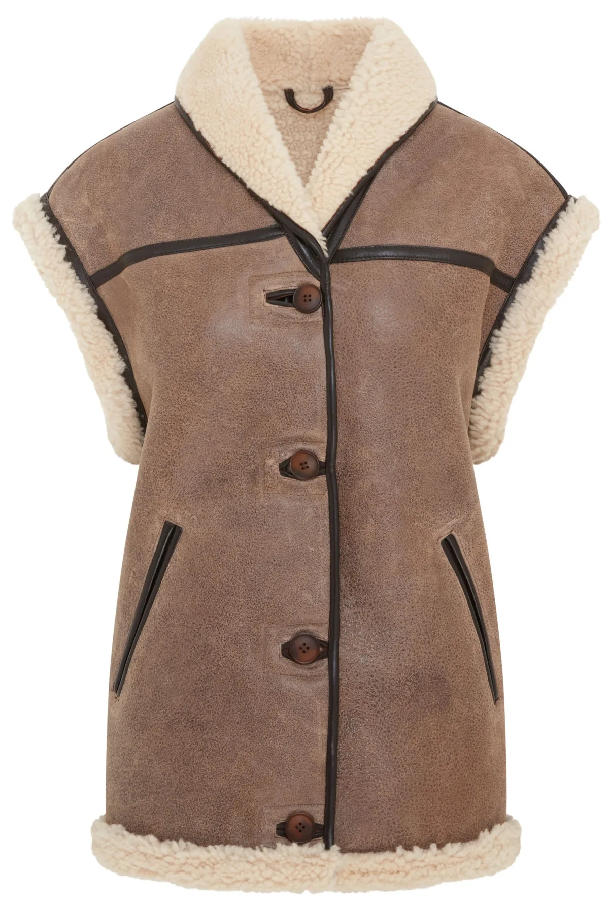 Voeg tijdloze elegantie toe aan uw wintergarderobe met dit damesvest van schapenvacht, een harmonieuze mix van verfijning en comfort. Met een luxueuze bruinbruine kleur, een zachte voering van schapenvacht en leren details. Perfect voor laagjes, combineert het uitzonderlijke warmte met tijdloze charme. • Premium dubbelzijdig schapenvacht • Zachte voering van schapenvacht voor superieur comfort • Knoopsluiting voor een klassieke look • Leren accenten voor extra elegantie • 2 steekzakken aan de zijkant voor gemak • Veelzijdige kraag, omhoog of omlaag gedragen voor stijl en warmte