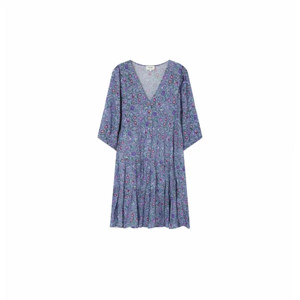 Grace & Mila damesjurk EsmeDe Esme snit is een korte babydoll jurk met 3/4 mouwen,V-hals en een knoopsluiting aan de voorkant. Gevoerde jurk.Kenmerken:Familie: JurkenKleur: BlauwMateriaal: 100% Katoen