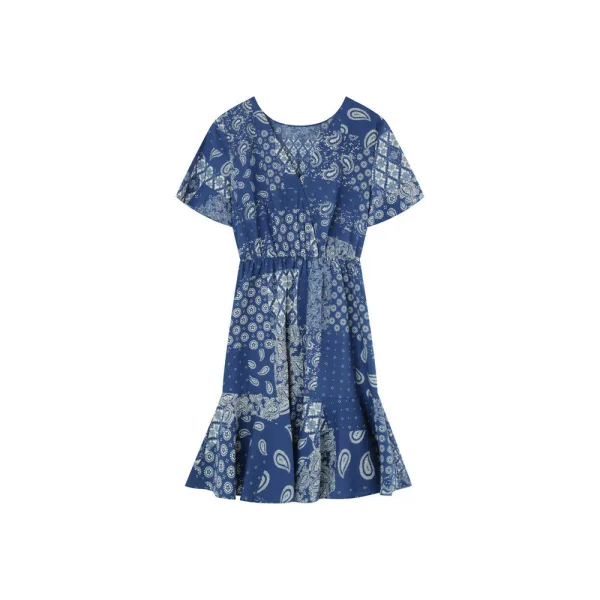 Kort jurkje met exclusieve G&M print. Ronde halslijn aan de voorkant en wikkel achter met verborgen drukknoop. Korte, uitlopende mouwen. Elastische taille. Geribbelde zomen. Omkeerbare jurk: voor en achter. Samenstelling : 100% Katoen