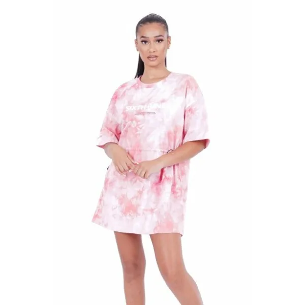 Vrouwen t-shirt jurk van Sixth June. Bind en verf blauw effect. Grote witte logoprint op de borst, elastische tailleband, patch-logo op de voorkant aan de onderkant. Grote maar verstelbare snit, mini lengte. Blauw model.