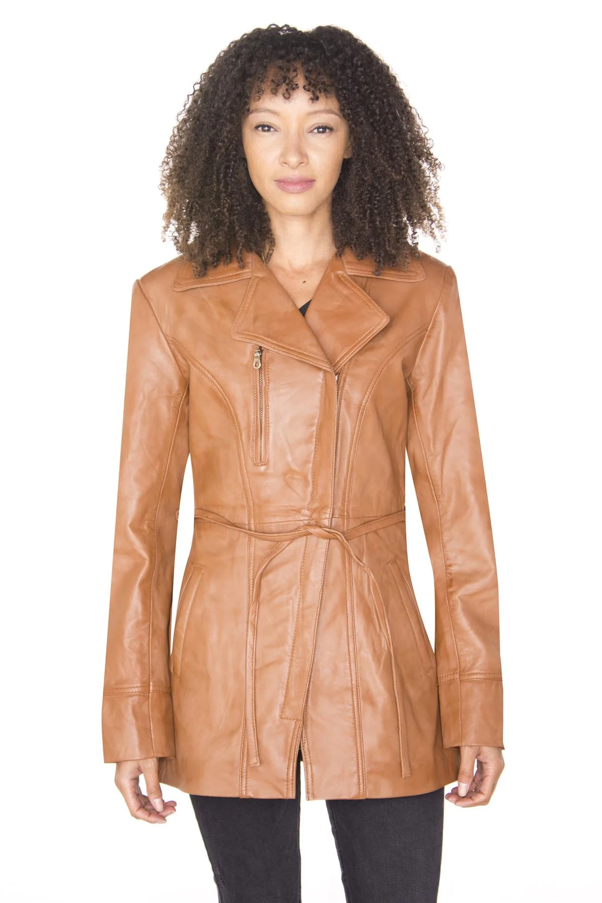 We hebben dit jasje ontworpen met een stijlvolle, eigentijdse look en een slim fit-silhouet, voor een jasje dat prachtig aansluit en chic is. De voorkant van de jas is afgewerkt met een dubbele rij knopen en een verborgen YKK-ritssluiting die doorloopt tot aan de stijlvolle wijdverspreide kraag met inkeping. Een skinny stropdas is geïntroduceerd in de taille en zorgt voor een moderne toevoeging die dit jasje een causale uitstraling geeft. Voor extra functionaliteit zijn er twee subtiele zakken in de taille met een extra Napoleonzak met ritssluiting op het bovenste juk. Verkrijgbaar in drie van onze klassieke premium kleurencombinaties. Dit is een strakke herinterpretatie van de klassieke bikerstijl. • 100% premium ultrazacht nappaleer • Voorzien van een skinny tailleband, twee subtiele taillezakken en een zak in Napoleonstijl • Slim fit ontwerp met verlengde lengte en verborgen YKK-ritssluiting