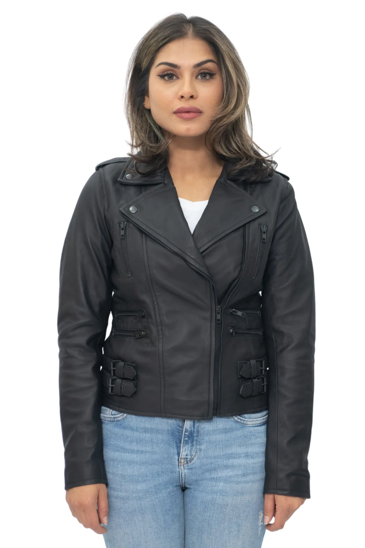 Dit bikerjack met dubbele rij knopen is een van onze bestsellers vanwege de strakke kenmerken en het silhouet die een uitgesproken stijlvolle uitstraling creëren. De voorkant van het jack is voorzien van verschillende ritszakken voor extra opbergruimte en karakterisering, en is bovendien voorzien van een flamboyante brede revers en schouderepauletten die beide met drukknopen kunnen worden vastgemaakt. Op de heupen zijn gespen aangebracht voor extra comfort en om een taps toelopend uiterlijk te creëren dat wordt gecomplementeerd door de slanke pasvorm en het verkorte ontwerp van dit jack. We bieden dit jasje aan in een grote verscheidenheid aan kleuren, zodat u dit kledingstuk kunt kiezen in elke stijl die bij uw voorkeur past. • 100% eersteklas, ultrazacht nappaleer • Voering van een premium polyestermix • Voorzien van niet-gecentreerde YKK-ritssluiting en brede ingekerfde revers • Voorzien van 6 buitenzakken met ritssluiting en verstelbare gespen op de heupen