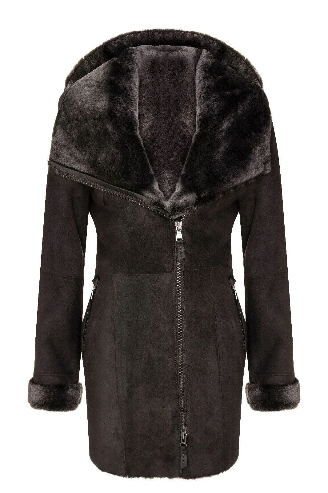 Dames merino schapenvacht jas met capuchon-antiek Prijzen