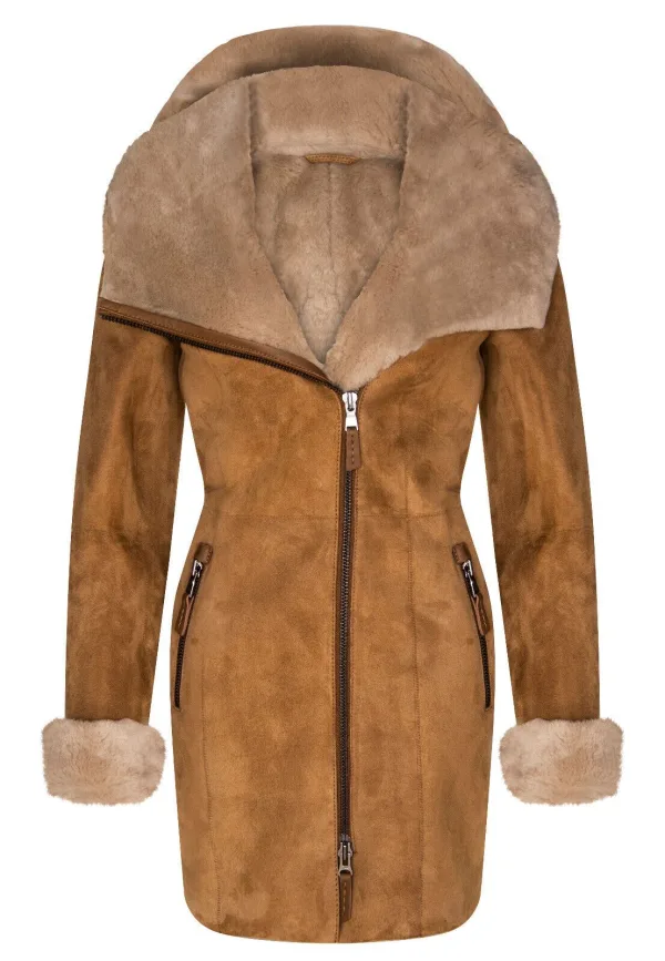 Dames merino schapenvacht jas met capuchon-antiek Prijzen