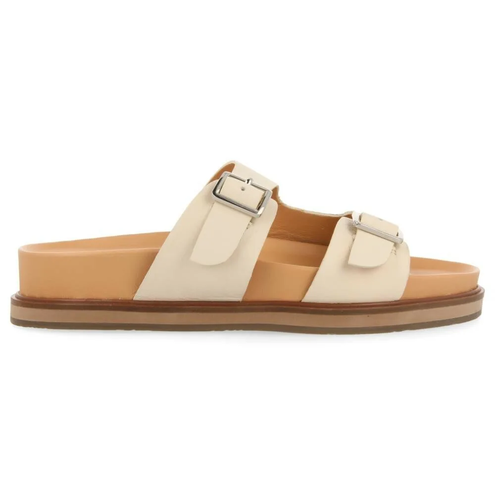 Off-white sandalen van organisch leer met gespdetail, anatomische latex binnenzool. Zool van 4 cm. Met dit model kom je dit seizoen overal. Een must-have!