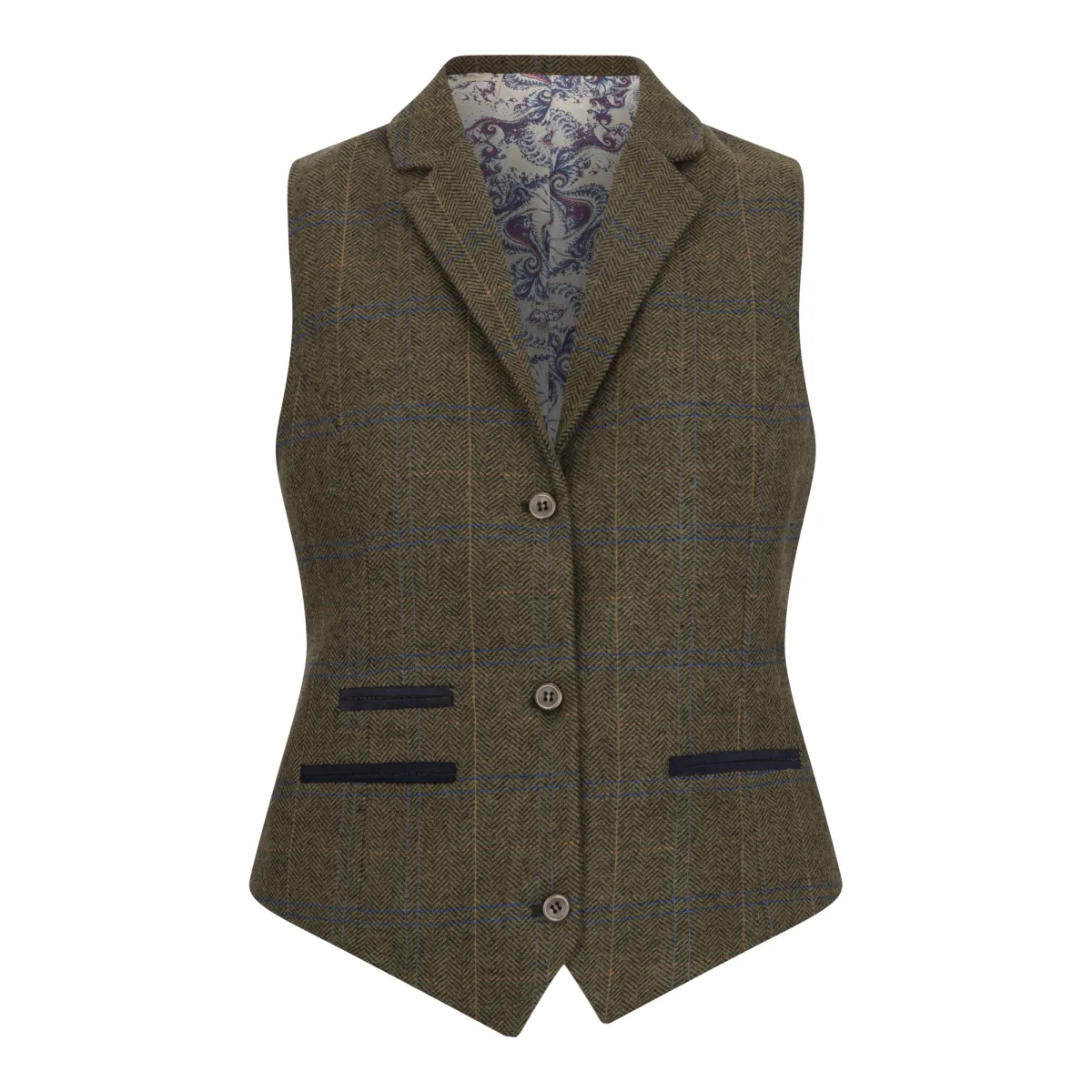 Dames olijfgroen getailleerde tweed gilet met visgraatmotief