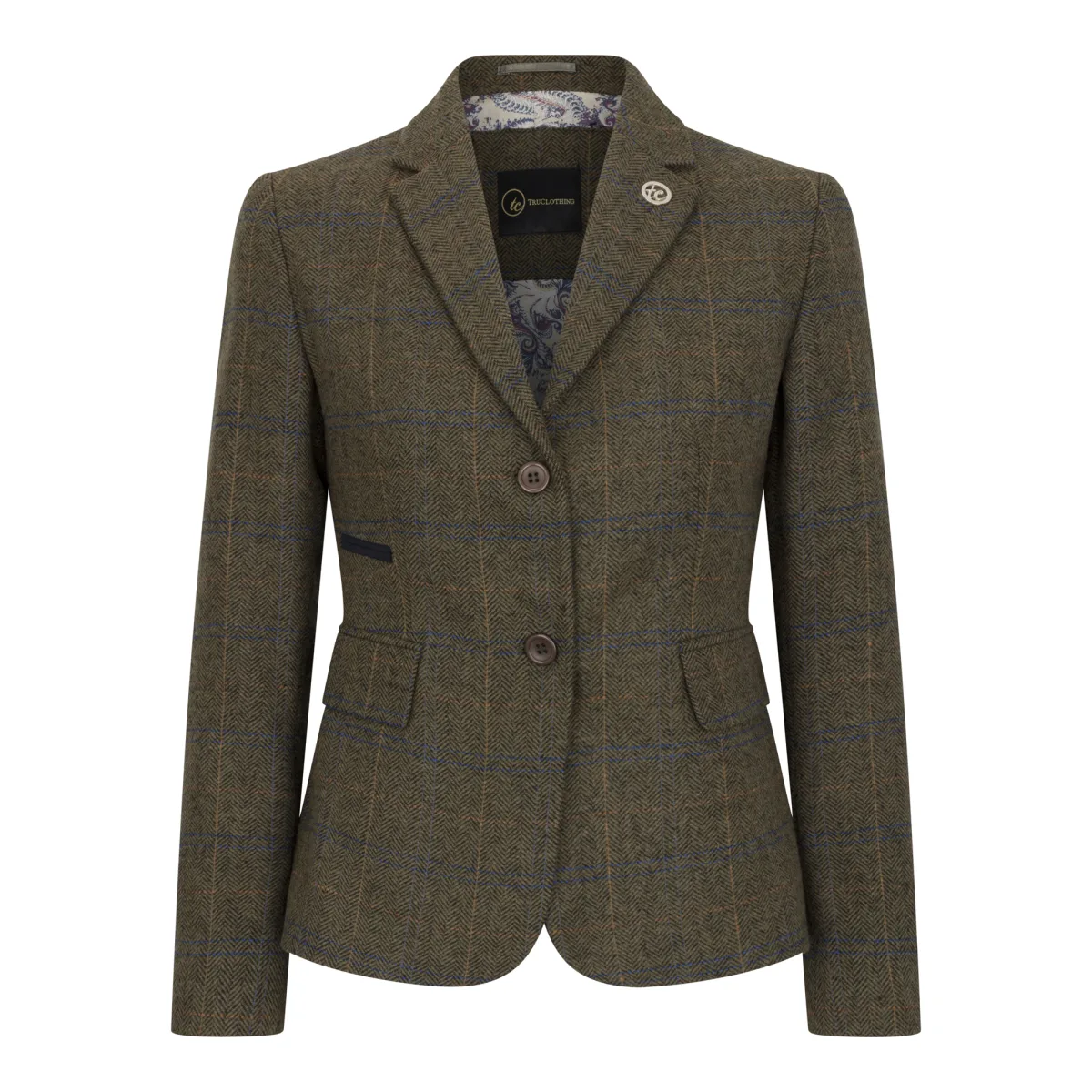 Dames olijfgroene tweedblazer met visgraatmotief Prijzen