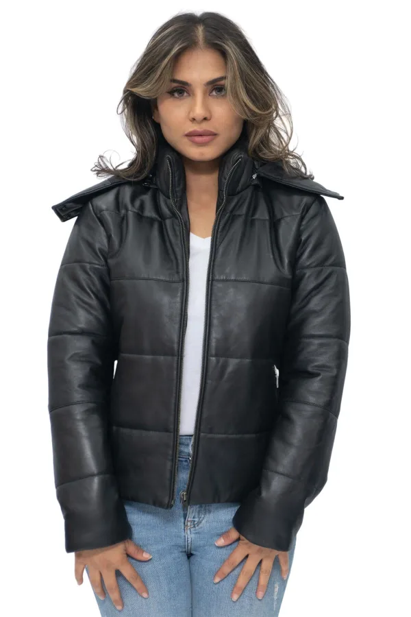 Blijf gezellig en stijlvol in ons leren pufferjack met capuchon voor dames. Deze jas is gemaakt van zacht en soepel nappaleer en voelt luxueus aan en gaat lang mee. Het beschikt over YKK-ritsen voor soepele en betrouwbare functionaliteit. Met twee buitenzakken op de taille en twee zakken op de voering heb je voldoende opbergmogelijkheden voor je essentiële spullen. Het gewatteerde en geïsoleerde ontwerp biedt uitstekende warmte en comfort bij kouder weer. De afneembare capuchon biedt veelzijdigheid, zodat u zich kunt aanpassen aan veranderende omstandigheden. De opstaande kraag voegt een vleugje elegantie toe aan de algehele look. Stap zelfverzekerd naar buiten in ons leren pufferjack met capuchon voor dames, dat mode, functionaliteit en premiumkwaliteit combineert. Ontwerpkenmerken: • Zacht en soepel nappaleer voor een luxueus gevoel • Gewatteerd en geïsoleerd ontwerp voor uitzonderlijke warmte en comfort • Afneembare capuchon voor veelzijdige stylingopties • Opstaande kraag voor extra elegantie en bescherming tegen de elementen • YKK-ritsen voor soepele en betrouwbare functionaliteit.