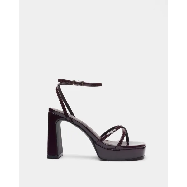 Sandal met hak van bordeaux satijn met platform. Opening aan de voorkant met bandjes en een rechthoekige hak. Sluiting met enkelbandje en metalen gesp.Niet wassenNiet gebruiken van bleekmiddelenNiet in de droger stoppenNiet in water onderdompelenVelours/Textiel - Schoonmaken met een zachte borstel of een harde sponsGlanzend leer/leer/synthetisch leer - Schoonmaken met een katoenen doek