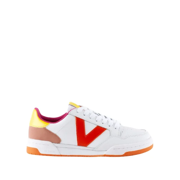 Retro stijl sportschoenen Victoria voor meisjes, met een combinatie van wit leer met verschillende veelkleurige inzetstukken in oranje, roze en geel die het geheel een unieke toets geven.Voeg wat kleur toe aan je look deze lente! Voering van textiel. Rubber zool. Gemaakt in P.R. China.