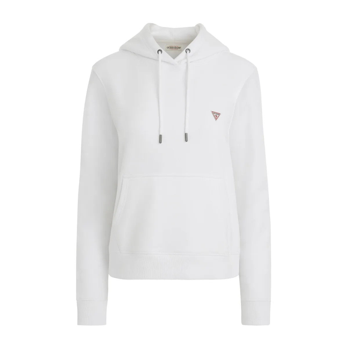 Guess Mini Triangle Sweatshirt voor dames, wit katoen. Authentiek Guess-kledingstuk - streetwear/sportwear design van Guess - Guess voor modebewuste vrouwen, perfect voor dagelijks gebruik - Deze witte Guess-sweatshirt combineert prachtig met de rest van je garderobe - Comfortabele katoenen stof - klassieke mini-driehoekstijl -