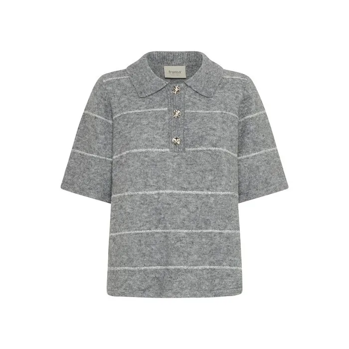 De korte mouwen gebreide polo-top heeft een ontspannen pasvorm, een klassieke kraag, een decoratieve knopenlijst en een zachte, textuur. Ideaal voor een veelzijdige stijl en comfortabel dragen, of het nu in een informele of verfijnde omgeving is.