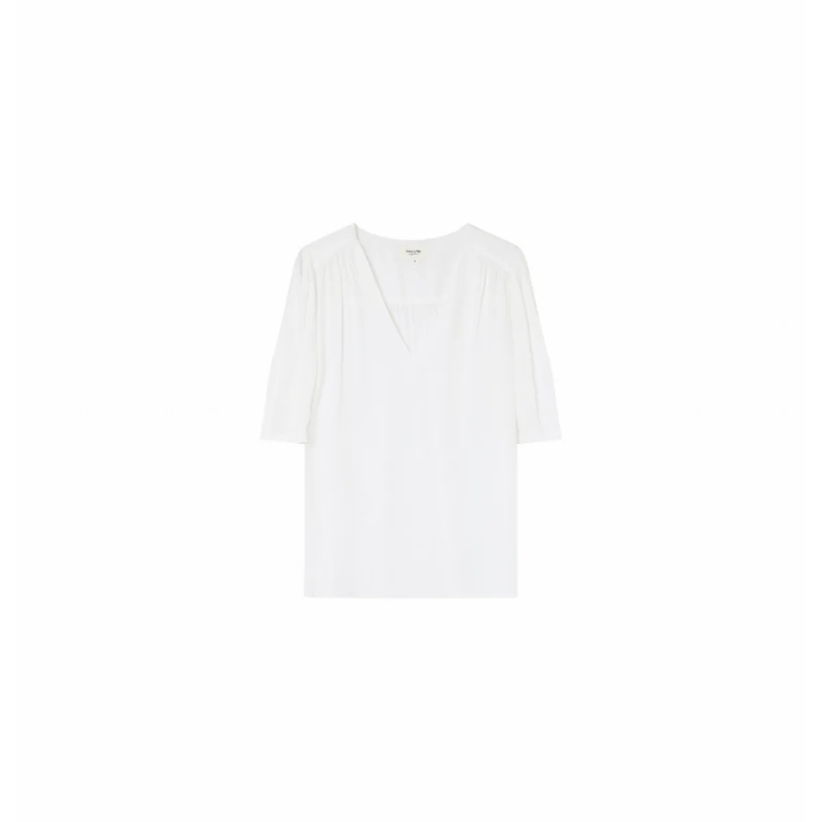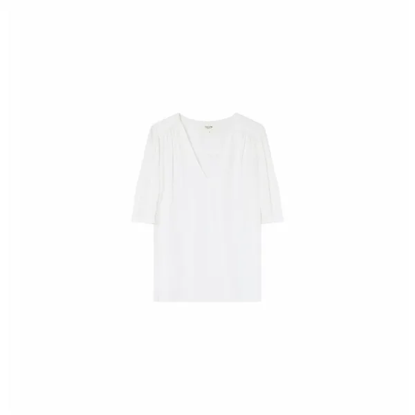 Grace & Mila dames-T-shirt EmoiKenmerken:Pasvorm: EMOI is een top met korte mouwen en V-hals, met ruchedetails op de buste en de schouders.Deze jacquard top is zeer comfortabel op de huid.Met zijn 100% rayon stof, voegt het zich bij ons gamma natuurlijke vezels.De pofmouwen en de relaxte pasvorm maken dit een gemakkelijk te dragen stuk met een romantisch tintje.Een goed alternatief voor alledaagse looks wanneer u flirterig wilt zijn zonder te overdrijven.Seizoen Lente - Zomer 2022