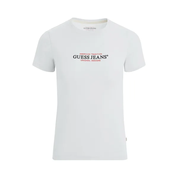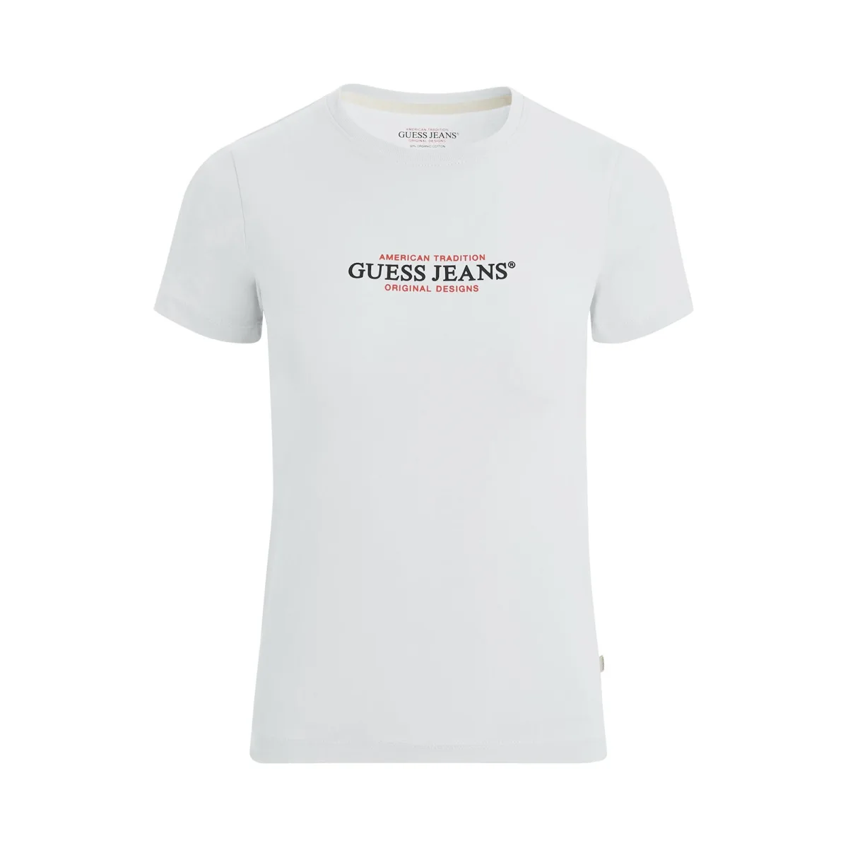 Wit katoenen T-shirt voor dames van Guess American. Authentiek Guess-merkkledingstuk - streetwear/sportkleding design van Guess - Guess voor dames, modieus en perfect voor dagelijks gebruik - dit witte Guess T-shirt past perfect bij de rest van je garderobe - comfortabele katoenkwaliteit - klassieke Amerikaanse stijl