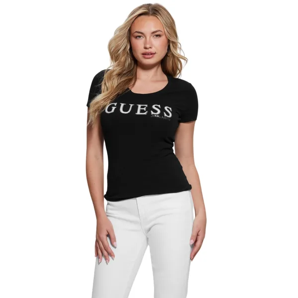 Guess T-shirt met strasssteentjes voor dames, zwart katoen. Authentiek Guess-merkkledingstuk - streetwear/sportkleding design van Guess - Guess-mode voor dames, perfect voor dagelijks gebruik - zwart Guess T-shirt dat perfect combineert met de rest van je garderobe - comfortabele katoenen stof - klassiek - strasssteentjes