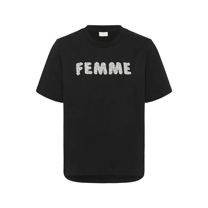 T-shirt met rechte pasvorm en korte mouwen. Voorzijde met opvallende pailletten 'FEMME'-tekst en een klassieke ronde hals.