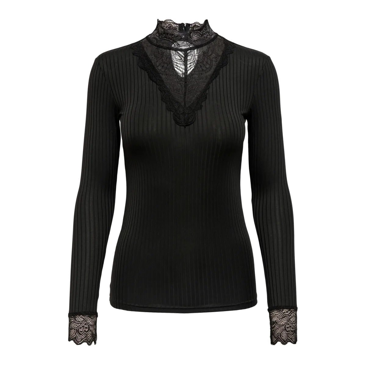 - Top van JACQUELINE de YONG - Lange mouwen - Hoge kraag - Kanten details aan de voorkant en onderkant van beide mouwen - Stretchy materiaal met ribbels - Lengte: 64 cm in maat M - Het model draagt maat S