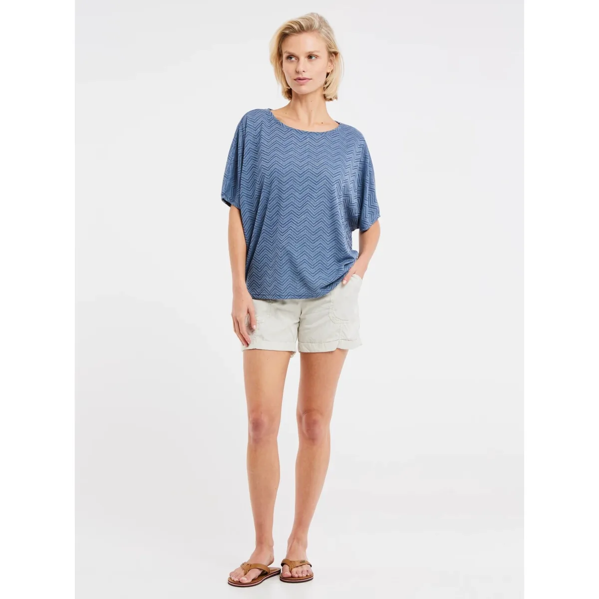 Ontdek de prachtige PRTJABA van Protest. Dit loose-fit T-shirt is gemaakt van twee stukken stof, de voor- en achterkant. Het lijfje en de mouwen zijn gemaakt van één stuk stof. Het resultaat is een mouwloze snit die zowel eenvoudig als vrouwelijk is. De gebreide jacquardstof heeft een verticale structure in de vorm van zigzagstrepen. Het model is regular fit en de lengte is ook regular. Het PRTJABA T-shirt van Protest is een must-have look deze zomer.