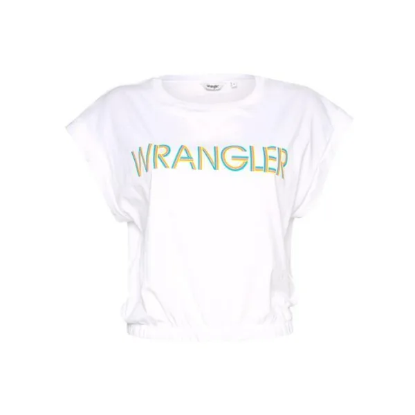 Kort T-shirt met authentiek Wrangler logo in fris wit. Het originele en moeiteloze Wrangler T-shirt, kort voor de zomer. Klassieke snit en ronde hals met iconisch logo op de borst. Uw startpunt voor zomerherinneringen.