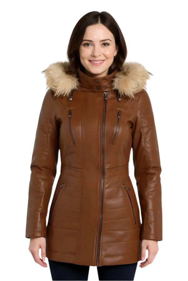 Verrijk je wintergarderobe met onze slim-fit leren parka voor dames, de perfecte keuze om warm en stijlvol te blijven in kouder weer. Deze jas is gemaakt van 100% premium ultrazacht nappaleer en biedt een luxe en comfortabel gevoel. Dit is wat hem onderscheidt: Afneembare capuchon met bontvoering: De jas heeft een afneembare capuchon met bontvoering, die zowel warmte als een uitbundige look biedt die een vleugje verfijning toevoegt aan je winterkleding. Functionele ritszakken: Vier ritszakken aan de voorkant van de jas, met lipjes voor eenvoudige opening, bieden veilige en handige opbergruimte voor je essentials. Luxe gewatteerde details: Gewatteerde details op de mouwen en taille voegen een vleugje luxe en textuur toe aan het ontwerp van de jas, wat de visuele aantrekkingskracht versterkt. Hoge opstaande kraag: De hoge opstaande kraag, vastgemaakt met drukknopen, houdt je niet alleen warm, maar voegt ook een chique en elegant element toe aan de algehele look. Manchetten met rits: Manchetten met rits bieden extra verstelbaarheid en stijl, waardoor je de mouwlengte naar wens kunt aanpassen. Deze leren parka voor dames combineert mode, functionaliteit en hoogwaardige kwaliteit. Het is een onmisbare aanvulling op uw wintergarderobe voor een chique en comfortabele look.