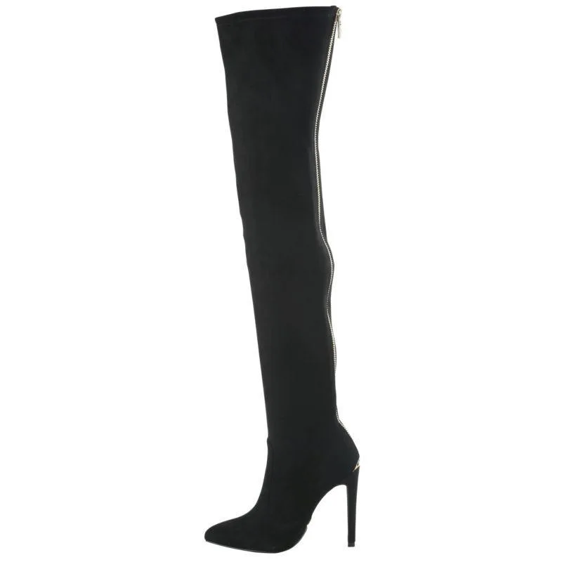 De elegante Marjorie dijhoge laarzen zijn een van onze meest populaire modellen, en niet zonder reden. Het stretchy, suède-achtige materiaal voelt aan als een tweede huid op je benen. Dit model laat minirokjes en jurkjes er goed uitzien. De hoge naaldhak is een echte blikvanger.Kenmerken:zwart suède kunstleder past perfect dankzij de elastische inzetstukken11 cm naaldhak