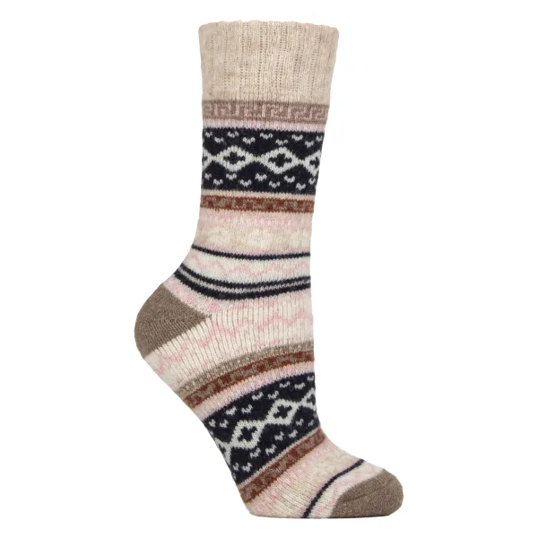 Country Pursuit - 1 Verpakking Dames Hebrides Wand socks: Stap in comfort met de Country Pursuit Hebrides Wandelsokken, nu speciaal ontworpen voor vrouwen. Gemaakt van een supersoft Fairisle wolmix, bieden deze sokken natuurlijke isolatie om je voeten warm en gezellig te houden in koud weer. Of je nu naar buiten gaat of binnen blijft, ze bieden de perfecte mix van comfort, duurzaamheid en stijl voor dagelijks gebruik. Het klassieke Fairisle patroon geeft een charmante, traditionele uitstraling, terwijl de middelzware brei de sokken ideaal maakt om te combineren met laarzen of winterschoenen. De ribgebreide boord zorgt voor een snug fit die op zijn plaats blijft, en de gevoerde zool voegt ondersteuning toe waar het het meest nodig is voor lange wandelingen of langdurig dragen. Deze sokken zijn perfect voor wandelen, hiken of relaxen thuis, en bieden zowel prestaties als warmte. Verkrijgbaar in zachte, vrouwelijke tinten die bij je seizoensgarderobe passen. Extra Productdetails: Materiaal: Supersoft Fairisle wolmix Maten: UK 4-8 Kleuren: Lilac, Havermout, Roze Stijl: Gevoerde bootsokken voor buitengebruik Ideaal voor hiken, wandelen of wintercomfort Ribgebreide bovenkant voor een snug fit Warm en ademend Machinewasbaar